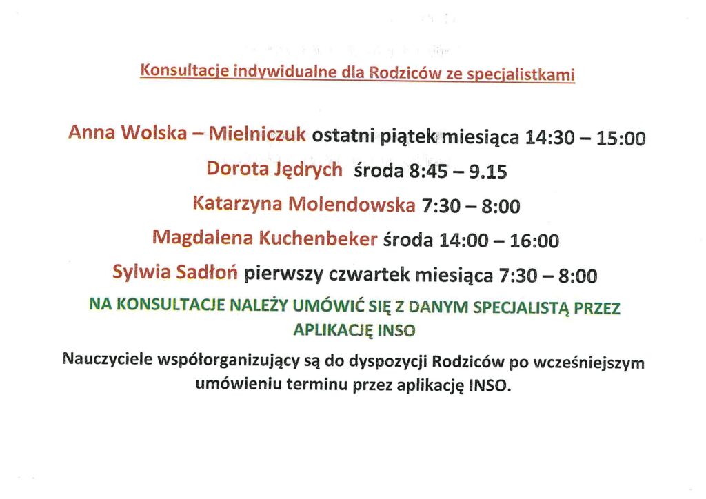 NA KONSULTACJE OBOWIĄZUJĄ ZAPISY U WYCHOWAWCÓW ODDZIAŁÓW